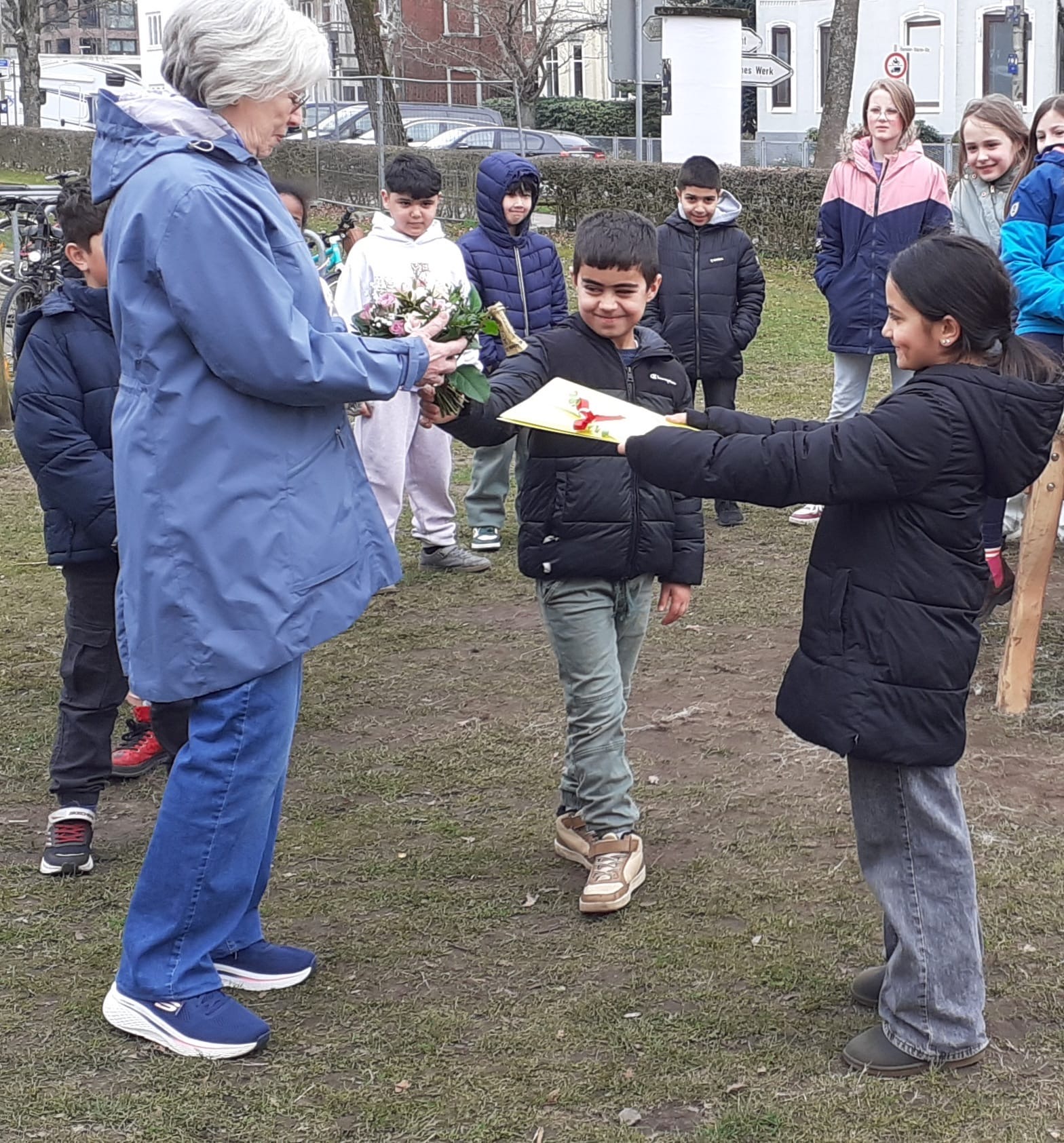 Am 24.3. kam die Spenderin Frau Lahan zu Besuch und Lawin und Maria aus der 3a haben ihr einen Blumenstrauß und eine Mappe mit Bildern überreicht, die die dankbaren Kinder der Bürgerschule für sie gemalt haben.
